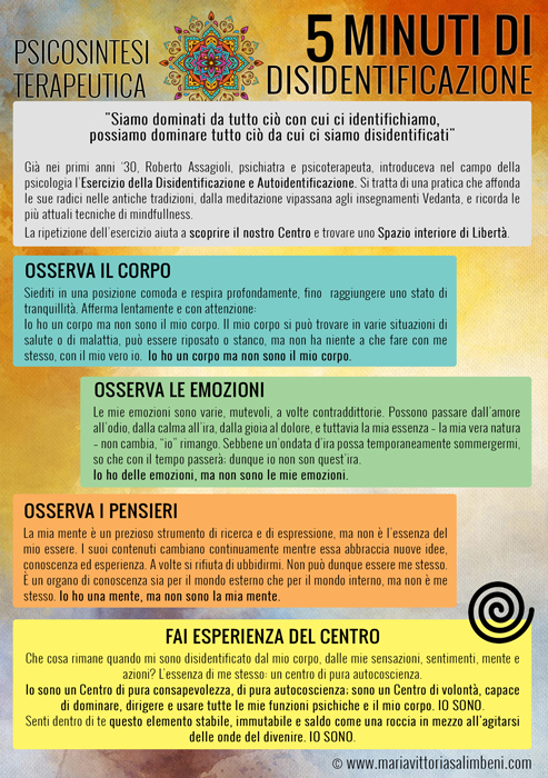 Già nei primi anni ‘30 Roberto Assagioli, psichiatra e psicoterapeuta fondatore della Psicosintesi, introduceva nel campo della psicologia l’Esercizio della Disidentificazione e Autoidentificazione.